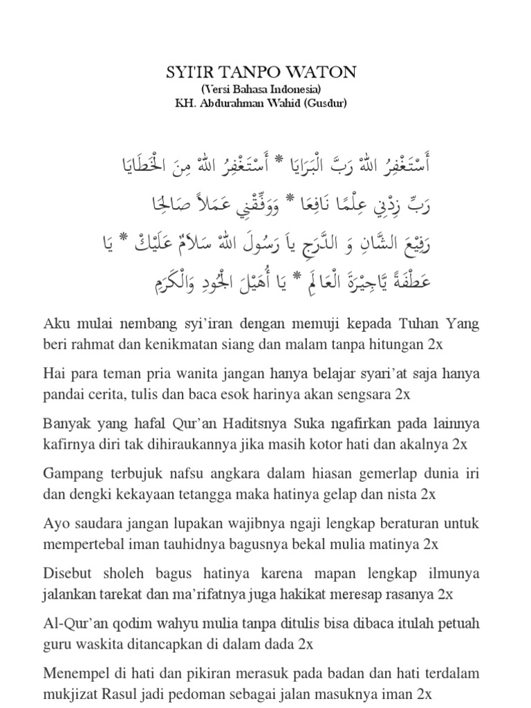 Syia Ir Tanpo Waton Pernah Dilantunkan Di Depan Gus Dur Terlebih lagi secara kepribadian gusdur memang memiliki daya pemikiran dan daya nalar yang sangat kuat, selain berkharismatik bagi umat islam, beliau juga sangat di hormati oleh.